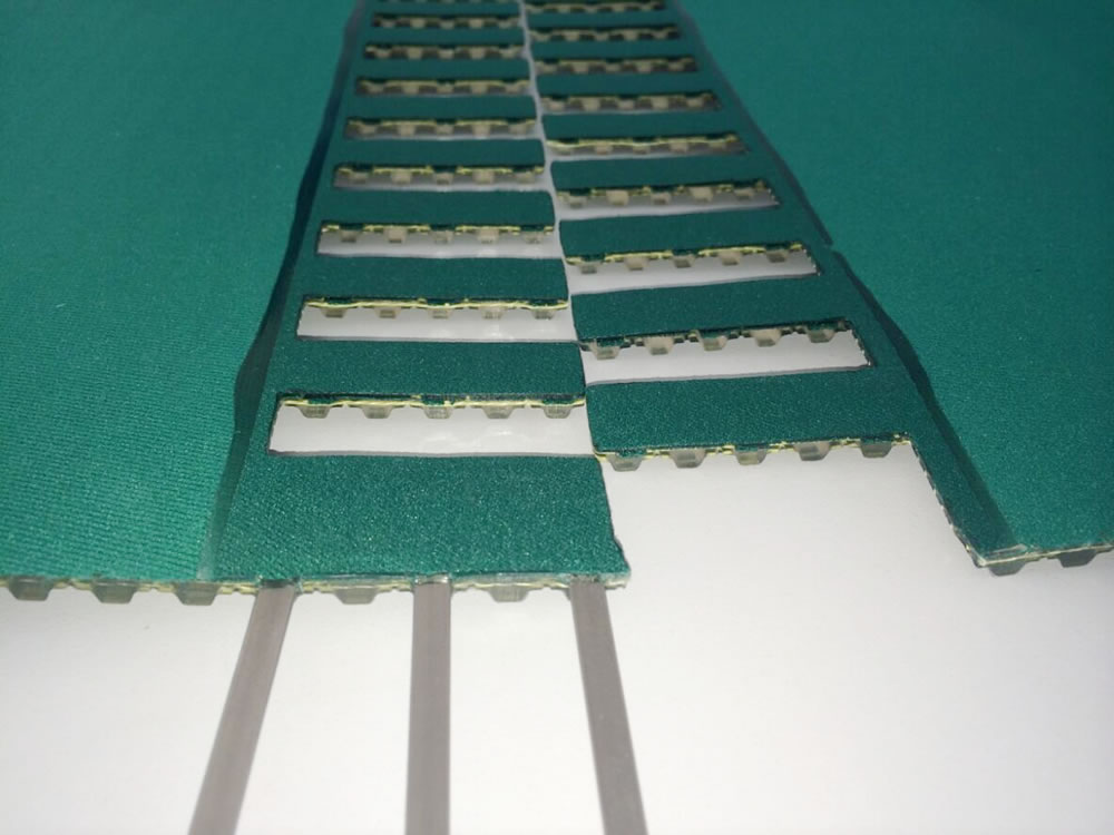 Le système de fixation mécanique ERO Joint® WT est spécifique aux courroies larges : les goupilles de fixation sont situées à l'arrière de la courroie, ce qui laisse la possibilité d'usiner les dents. Des goupilles en plastique peuvent également être utilisées.